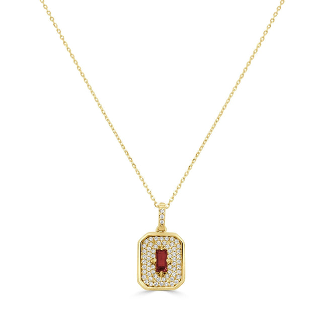 14K Yellow Gold Pave' Diamond Baguette Ruby Dog-Tag Pendant .33Ct Total Ruby Weight / .26Ct Total Diamond Weight (18in Chain Included)