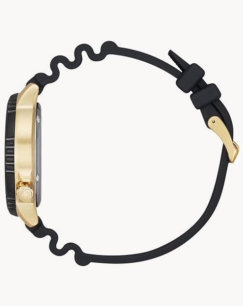 The popular Promaster Dive watch series has been refreshed with new color details. The gold-tone stainless steel case is paired with a black polyurethane strap and a sleek black dial. The hands and markers are both luminous, so you’ll be able to see them underwater with ease — the watch is ISO certified for depths up to 200 meters. It features a one-way rotating bezel, and is anti-shock and anti-reflective, making this Citizen dive watch as practical as it is stylish. And the watch is sustainably powered by light with the exclusive Citizen Eco-Drive technology, so there are no worries about a dead battery while exploring the waters of the world. For everyone looking to blend form and function, this is a men’s watch that can’t be missed.