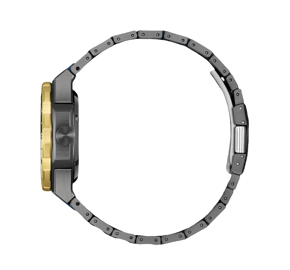 A tapered, integrated stainless steel H-link bracelet secures the watch to the wrist, with its design following the aesthetic of the case via the use of polished and brushed facets. Beneath a sapphire crystal, the watch's winter-inspired, gradient dial features gold-tone applied indices and lume-filled hands, each working together to offer incredible legibility alongside a utility-driven 3 o'clock date window; an arrow-tipped hand assists in keeping track of multiple time zones.