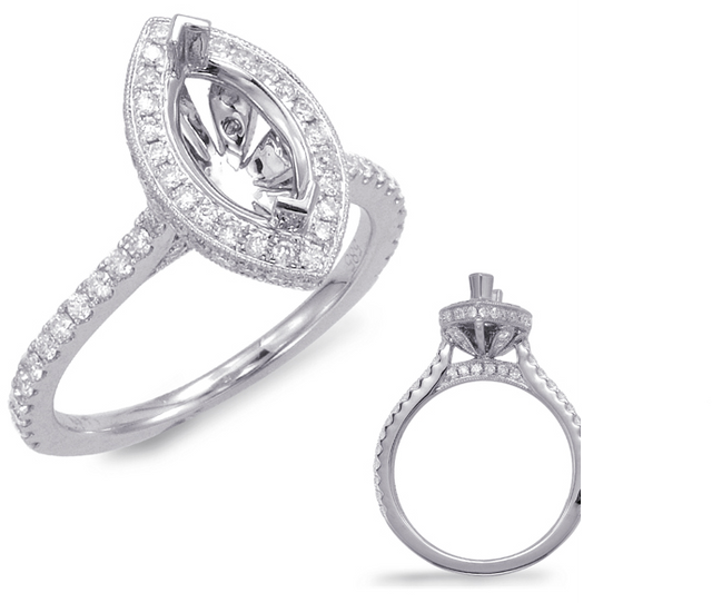 14K White Gold Marquise Halo Diamond & Milgrain Accented Semi Mtg .69Ct Total Diamond Weight