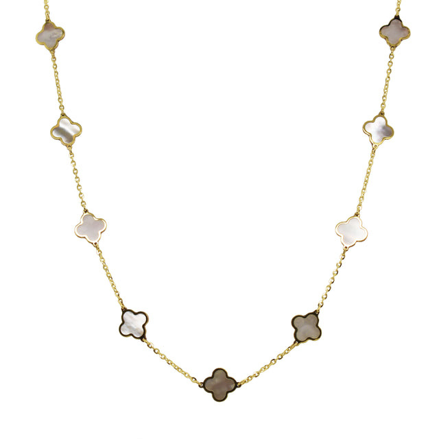 Each clover symbolizes good luck and positivity, making this necklace a meaningful addition to any jewelry collection. The alternating white and gray mother-of-pearl inlays add depth and a touch of sophistication to the design. These luminous charms are linked along a fine gold chain, creating a fluid and graceful silhouette that drapes beautifully around the neck.