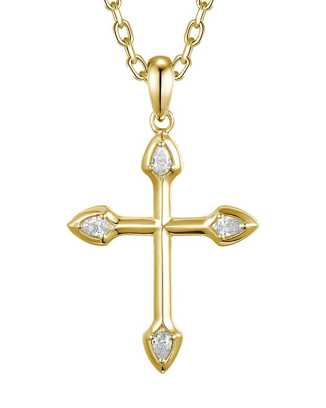 14K Yellow Gold Pear-Diamond Tipped Cross Pendant .18Ct Total Diamond Weight