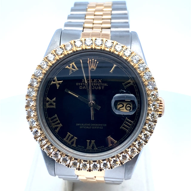 1978 Rolex Datejust 36mm16013 Custom Roman Numeral Dial 18K Yellow Gold Custom Diamond Bezel 2.66Ct Total Diamond Weight