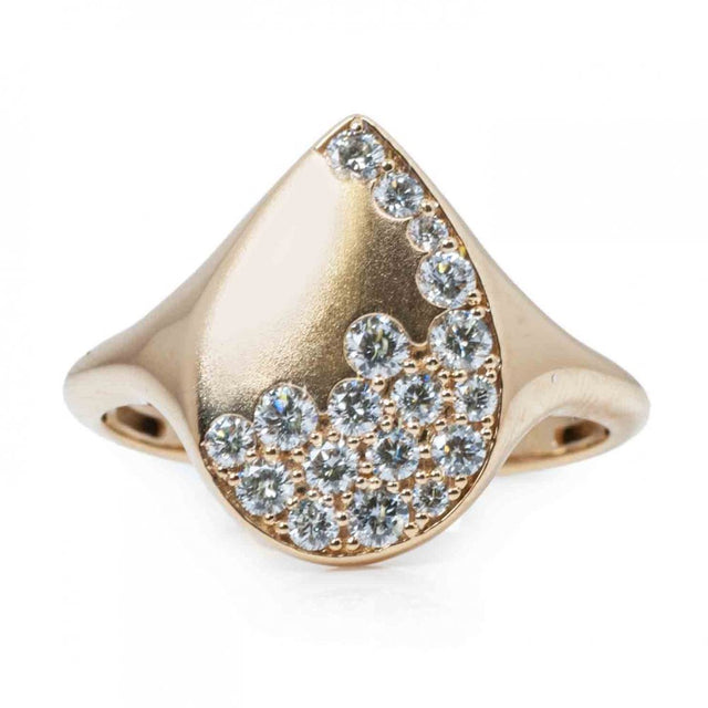 14K Yellow Gold Pear-Shaped Signet Ring Satin Finish Confetti Diamonds .50Ct Total Diamond Weight