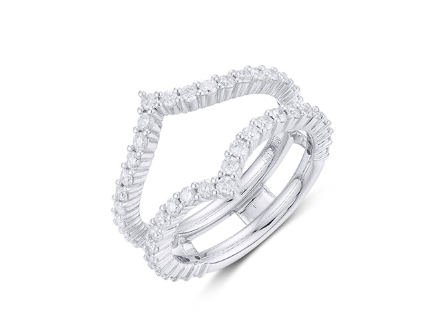 Designed to contour beautifully around solitaires or three-stone rings, the chevron silhouette creates a captivating V-shape that adds depth, brilliance, and a touch of modern flair to any bridal set. The open gallery and expertly engineered inner bridge ensure a secure fit while allowing light to pass through, enhancing the brilliance of both the enhancer and the center ring it surrounds.