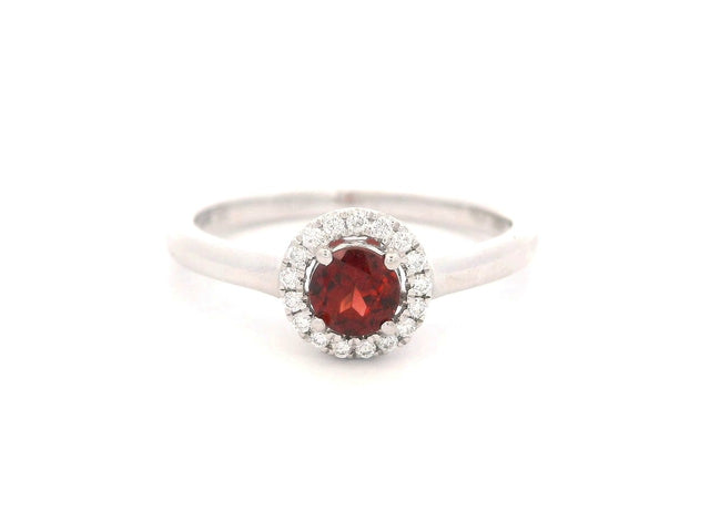 14K White Gold Round Garnet with Diamond Halo Ring .07Ct Total Diamond Weight / .36Ct Total Diamond Weight