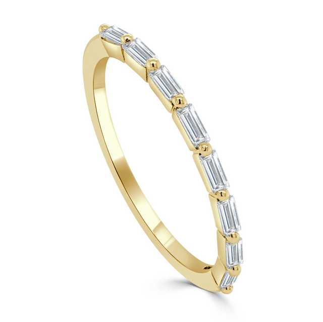 The baguette diamonds are celebrated for their clean lines and understated sparkle, perfectly complemented by the refined gold band. Each diamond is securely held in place with prong settings, allowing maximum light to illuminate their clarity and brilliance. This band’s minimalist yet striking design makes it an ideal piece for layering with other rings or wearing as a standalone statement.