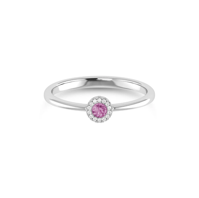 14K White Gold Petite Pink Tourmaline Diamond Halo Stackable Fashion Ring .03Ct Total Diamond Weight