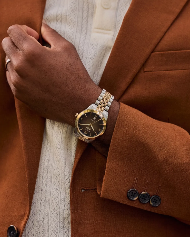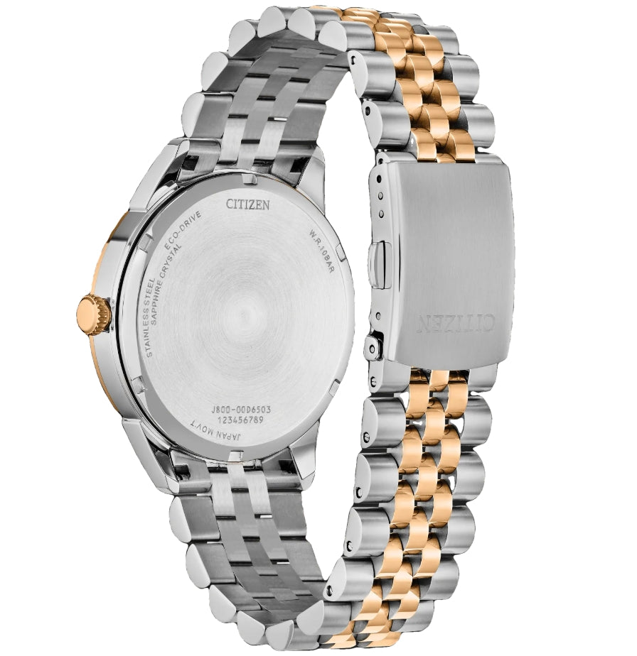 This vintage-inspired timepiece is a paragon of timeless elegance. With a 40.5mm, two-tone silver- and rose gold-tone case and matching five-link bracelet, the new Rolan features a rich brown dial with a gradient effect. Applied rose gold-tone accents and Arabic numerals at the quarter hours add to its charm, while day and date indicators on opposite sides of the top and bottom of the dial place the watch firmly in the realm of retro-style. The watch features Citizen's Eco-Drive technology – sustainably powered by light, any light, and never needs a battery. Water resistant to 100 meters. Caliber J800.