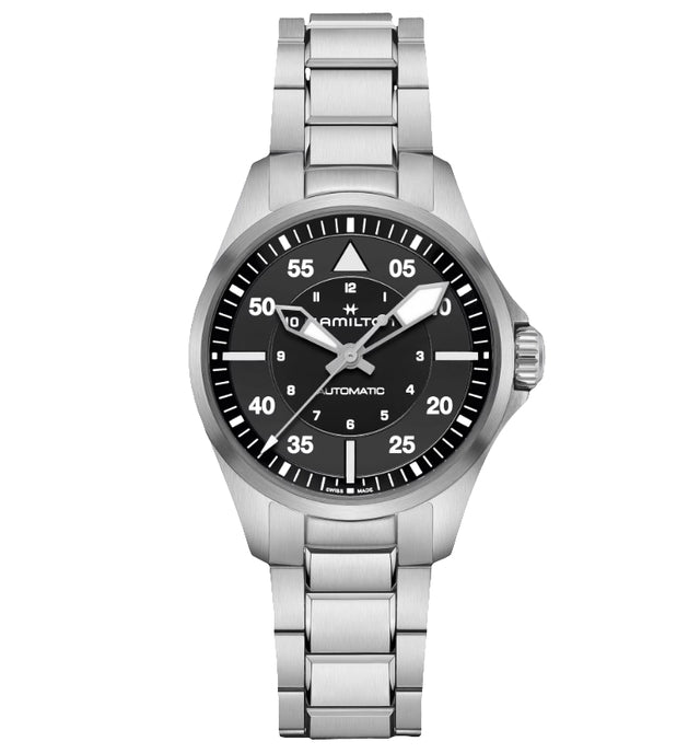 Crafted for true aviation lovers, the Khaki Pilot Auto evokes the spirit of exploration and adventure of the Khaki. Powered by the H-10 automatic movement with an 80-hour power reserve and Nivachron™ balance spring, the 36mm versions answer the trend for smaller watches. While up to the standards of precision for the cockpit, these more compact designs lend themselves to life in the skies and on terra firma. The Khaki Pilot Auto pairs a timeless stainless-steel bracelet with a stylish black dial and special Super-LumiNova coating for greater readability.