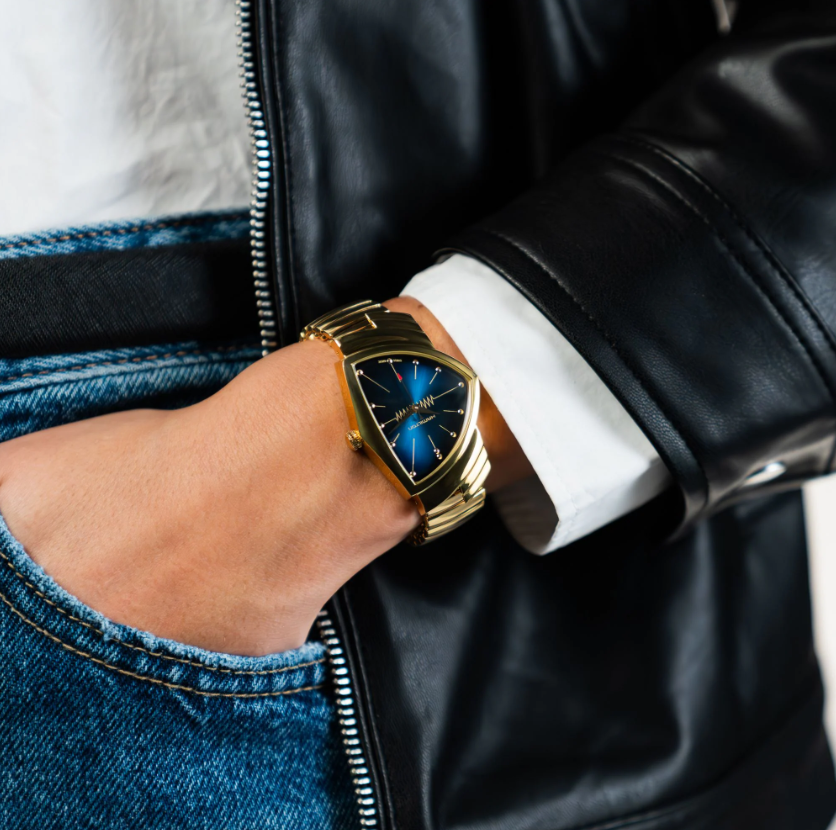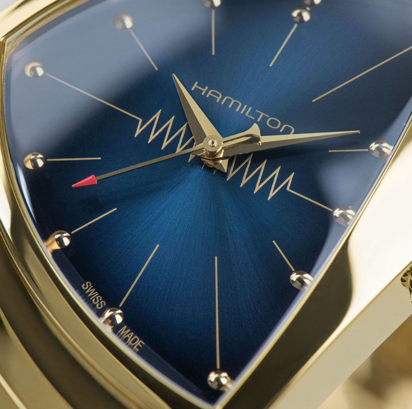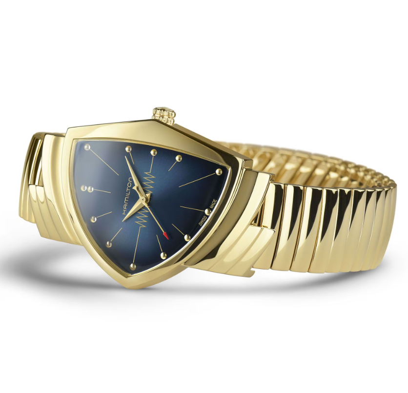 In 1957, Hamilton introduced the first electric watch, the Ventura. This revolutionary timepiece ushered in a new era of watchmaking, establishing itself as an emblem of futuristic design and as a symbol of innovation. Inspired by Elvis Presley's hit single, "Blue Suede Shoes", the Ventura Quartz is equipped with nickeled hour, minute, and second hands, and powered by a trusted 3-jewel quartz movement. The iconic, triangular stainless steel case is coated in yellow gold PVD with a matching flex bracelet, while the deep blue dial calls to mind those famous shoes of Elvis.