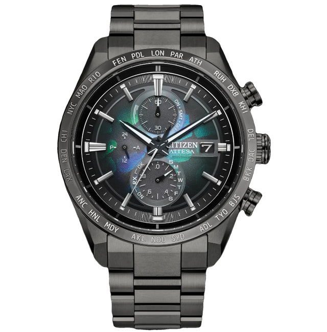 Joining the innovative Attesa line, the new watch features a scratch-resistant Super Titanium™ case with a black DLC coating, measuring 42mm in diameter. Secured to the wrist via a matching bracelet to solidify the lightweight, durable construction of the timepiece, a world time equipped bezel then hints at the elevated technological capabilities of the watch. On the terra-inspired dial, a three-register chronograph in a vertical display is at work, with touches of greens, purples, and blues adding crystalline-like dimensionality alongside the utility of a 3 o'clock date display.