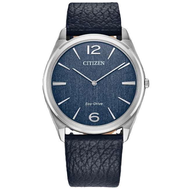 Classic lines and a simple silhouette define the newest addition to the Classic collection. This all-purpose dress watch features a versatile silver-tone stainless steel 38.4mm case, a two-hand blue dial featuring an entrancing metallic powder aesthetic with silver-tone hands and markers, and is secured to the wrist via a grained blue leather strap with buckle closure. The Citizen Suratto collection features a notably defining thin case at 4.71mm, and is sustainably powered by any light with Eco-Drive technology --which never needs a battery. Water resistant to 50 meters. Caliber G872.
